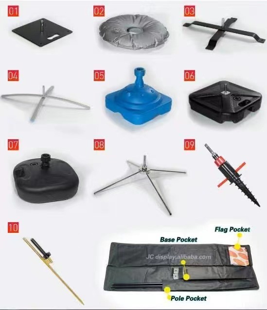 | Флагшток | 100% стекловолокно, 100% алюминий | База флага | Кроссовый, шипы, квадратный, водяной мешок, транспортное средство |